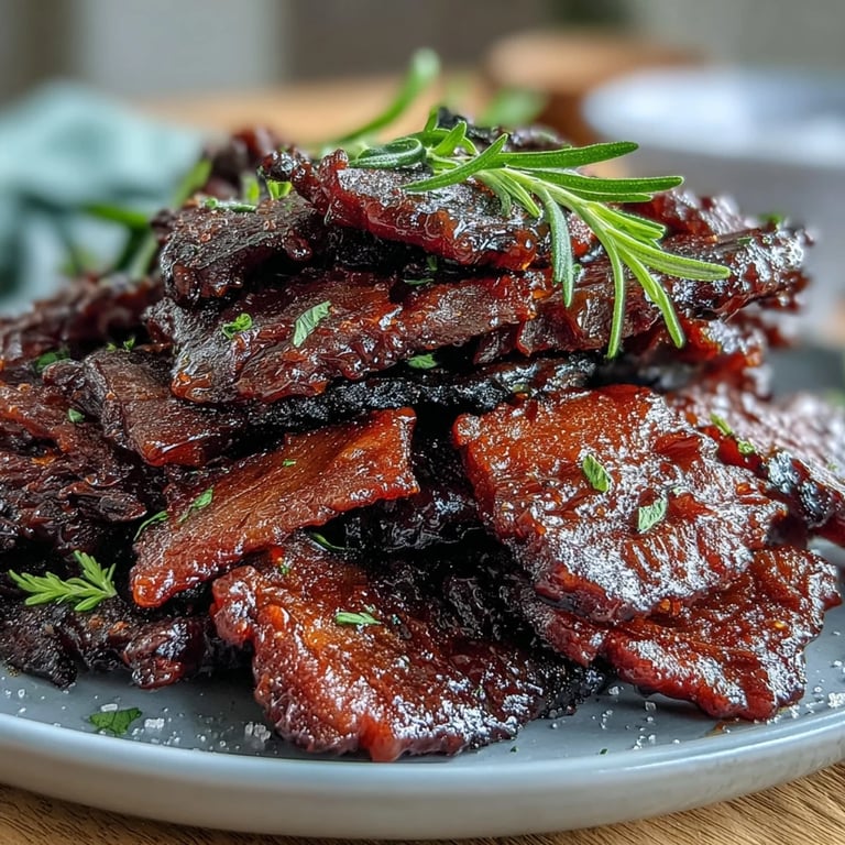 Save My neighbor showed up at my door one Saturday with a bag of homemade beef jerky that tasted like nothing I'd ever experienced—smoky, tart, almost jammy in the best way. When I asked what made it so different, he grinned and said black currant jam. That simple ingredient sparked an obsession. I spent weeks tweaking the recipe, burning batches in my oven, learning that patience with smoke and low heat changes everything. Now whenever someone bites into my version, they pause mid-chew, confused and delighted by that sweet-savory punch that doesn't taste like any jerky they've known.