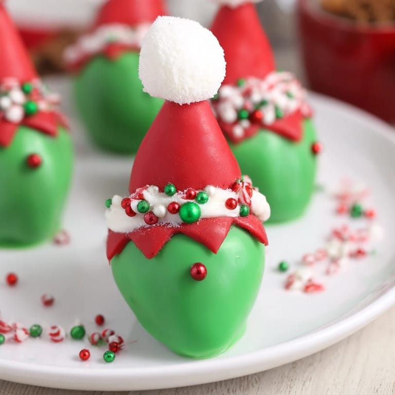 Save Festive, whimsical strawberries dipped in chocolate and decorated to resemble charming elf hatsβa delightful holiday treat perfect for parties and gifting.