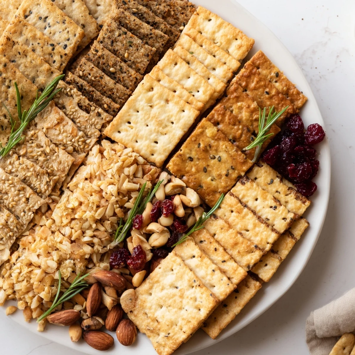 Save This cracker assortment offers guests both familiar favorites and exciting new tastes. Whether you prefer the subtle crunch of water crackers or the bold notes of rosemary sea salt and black pepper, this platter lets everyone discover their perfect match. The addition of optional garnishes and fresh herbs makes it as visually appealing as it is delicious.
