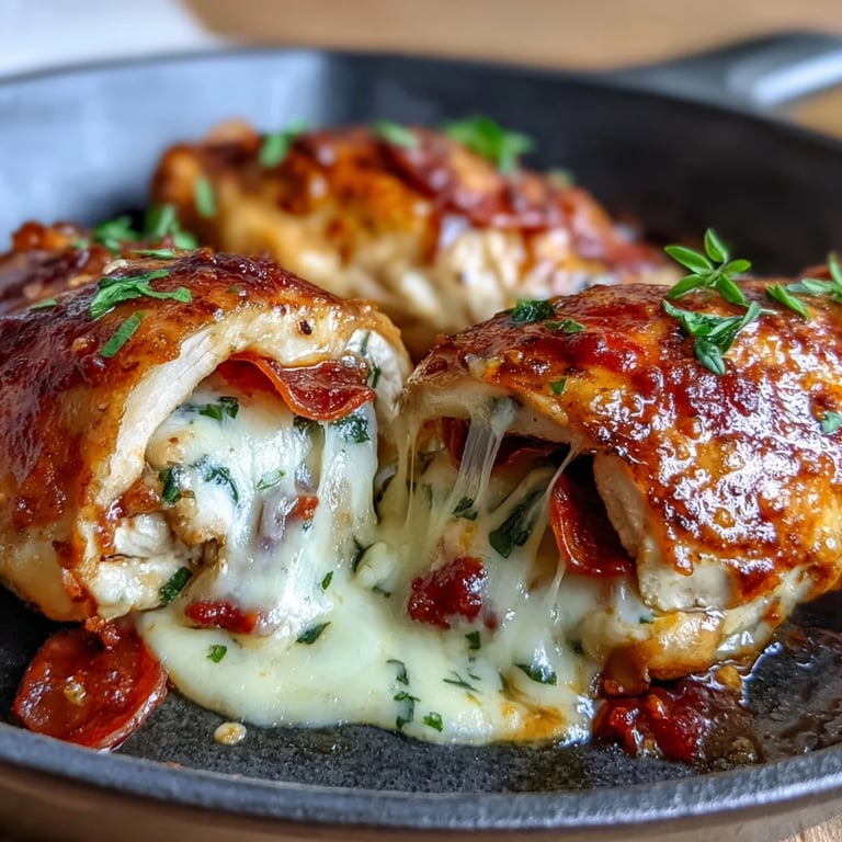 Save Transform your weeknight dinner routine with these irresistible Keto Pizza-Stuffed Chicken Breasts. This clever recipe captures all the flavors of your favorite pizza but wrapped in juicy chicken instead of carb-heavy crust. Each bite delivers a perfect harmony of tangy marinara, gooey mozzarella, and savory pepperoni that will satisfy your pizza cravings while keeping your carb count low.