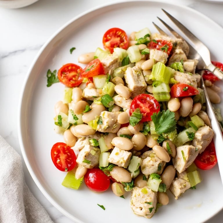 Save Last July, my kitchen was stifling hot and the thought of turning on the oven felt like punishment. I'd roasted a couple chicken breasts earlier in the week when the weather was decent, and they were sitting in my fridge begging to be turned into something else. A can of white beans, some celery that needed using, and a particularly fragrant lemon from the farmers market came together in this salad that I ate standing at the counter for three days straight.