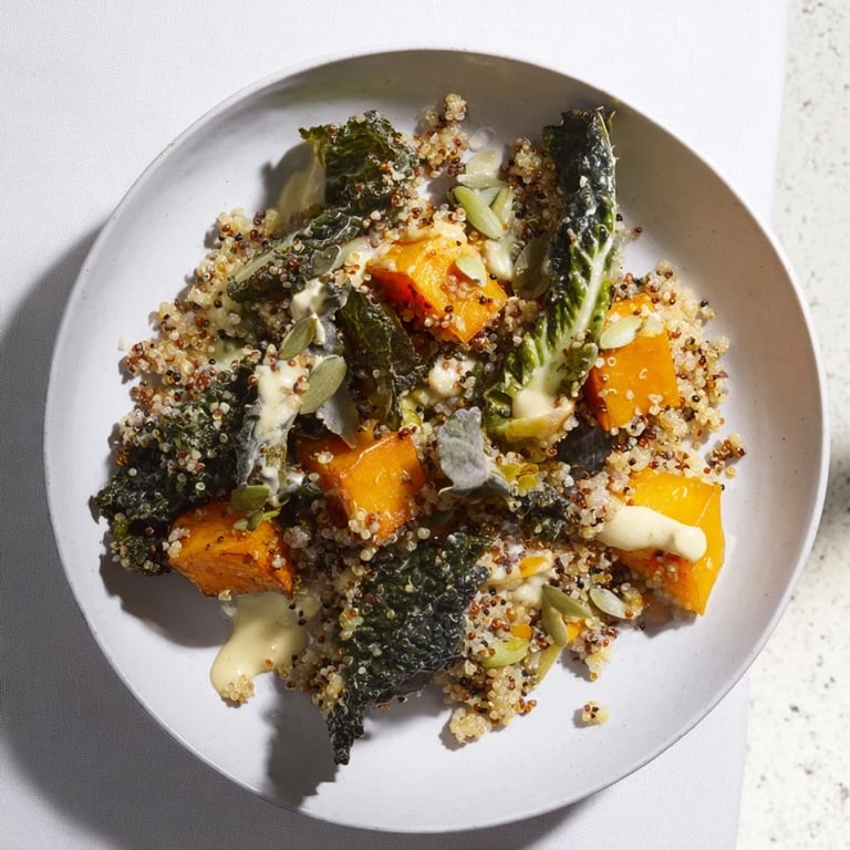 Save A vibrant, nourishing bowl featuring fluffy quinoa, caramelized roasted sweet potatoes, and crisp kale, finished with a zesty lemon-tahini dressing—a perfect light lunch or side inspired by coastal freshness.