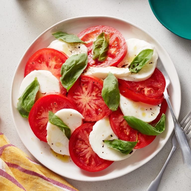 Save A fresh and vibrant brunch side featuring juicy tomatoes and creamy mozzarella, finished with fragrant basil and a drizzle of olive oil.