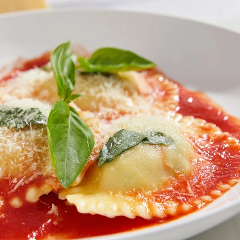 - Spoon a layer of warm sauce onto each plate, then arrange the hot ravioli on top. Drizzle more sauce over them, scatter fresh basil leaves, and finish with a generous grating of Parmesan.